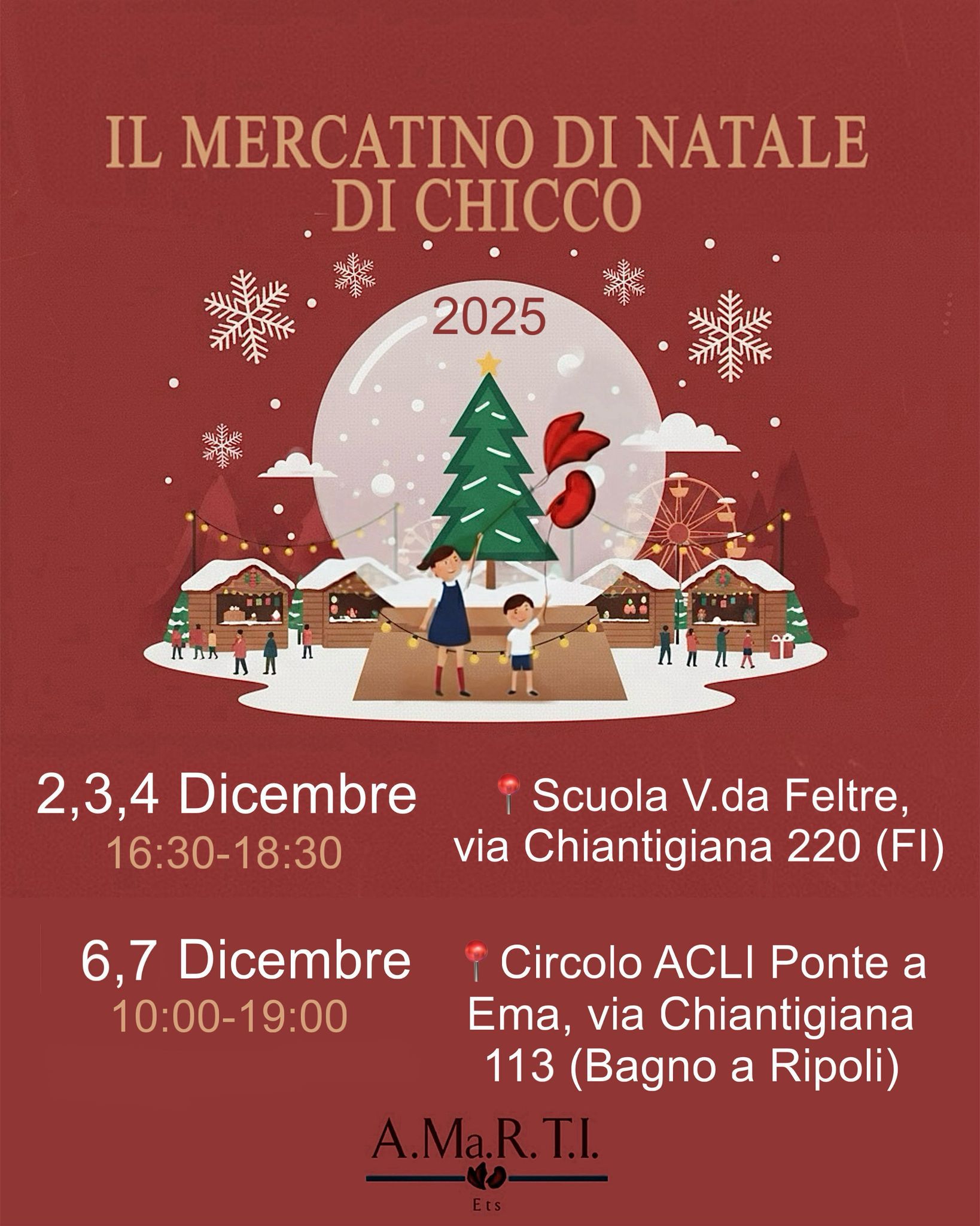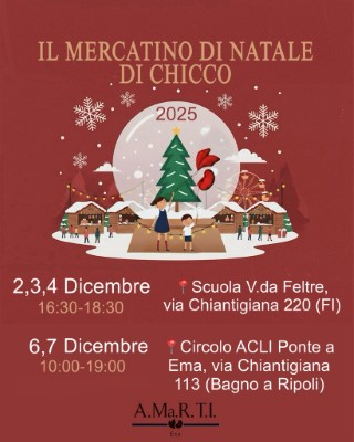 FirenzeMercatino di Natale di Chicco 2025Mercatino di Natale di Chicco 2025, presso Scuola V. da Feltre, via Chiantigiana 220, a Firenze, nei giorni 2, 3, 4 Dicembre 2025 dalle 16:30 alle 18:30 e poi successivamente presso Circolo ACLI Ponte a Ema, via Chiantigiana, 113, Bagno a Ripoli, Firenze, nei giorni 6 e 7 Dicembre 2025, dalle 10:00 alle 19:00.